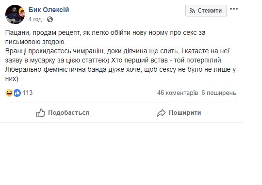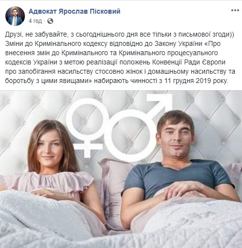 Закон №2227-VIII про внесення змін до розділів Кримінального кодексу «Злочини проти життя і здоров'я людини» і «Злочини проти статевої свободи та статевої недоторканості особи» вступив у дію 11 січня 2019 року. Це означає, що відтепер вводиться кримінальна відповідальність за секс без добровільної згоди.