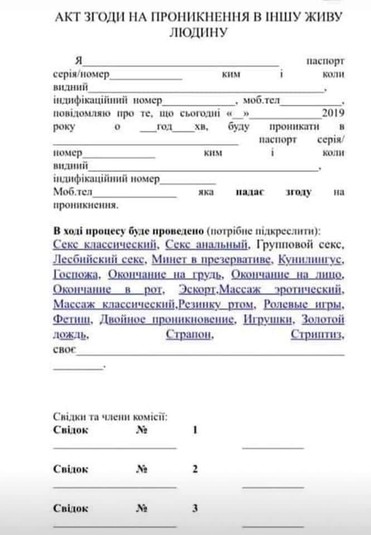 Користувачі соцмереж відреагували на нововведення жартами про необхідність брати розписку перед інтимом, щоб не загриміти у в’язницю за зґвалтування, і навіть запропонували варіанти бланків цих розписок:
