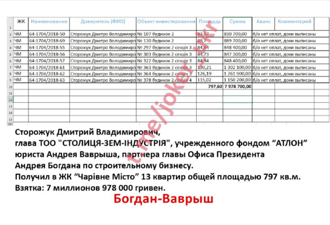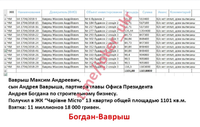 Автор «зливу» також додає, що, за його інформацією, Микитась в обмін на цю «дружбу» подарував Богдану, Єрмаку та іншим високопосадовцям десятки квартир, побудованих його корпорацією «Укрбуд». Серед тих, на кого «звалились» такі подарунки, зокрема, люди іншого впливового забудовника, близького до Офісу президента Андрія Вавриша – його син Максим та юрист Дмитро Сторожук.