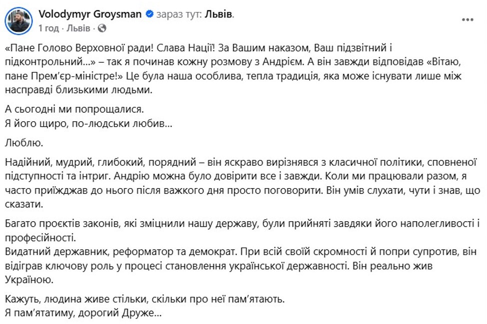 «Пане Голово Верховної ради! Слава Нації! За Вашим наказом, Ваш підзвітний і підконтрольний…» – так я починав кожну розмову з Андрієм. А він завжди відповідав «Вітаю, пане Премʼєр-міністре!». Це була наша особлива, тепла традиція, яка може існувати лише між насправді близькими людьми. А сьогодні ми попрощалися. Я його щиро, по-людськи любив… Люблю», – щемливо написав ексглава уряду Володимир Гройсман.