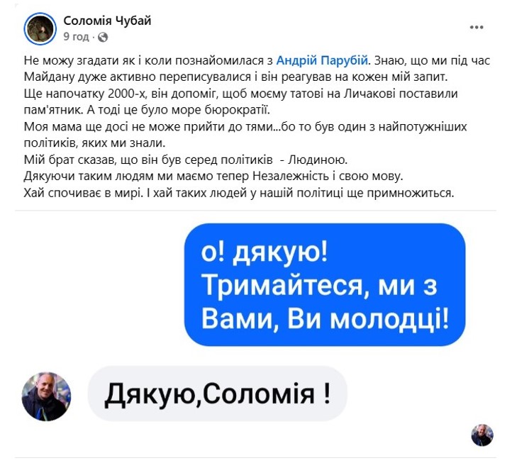 Львів’янка, співачка Соломія Чубай написала: «Не можу згадати, як і коли познайомилася з Андрієм Парубієм. Знаю, що ми під час Майдану дуже активно переписувалися, і він реагував на кожен мій запит. Ще напочатку 2000-х він допоміг, щоб моєму татові на Личакові поставили пам'ятник. А тоді це було море бюрократії. Моя мама досі не може прийти до тями... бо то був один з найпотужніших політиків, яких ми знали».