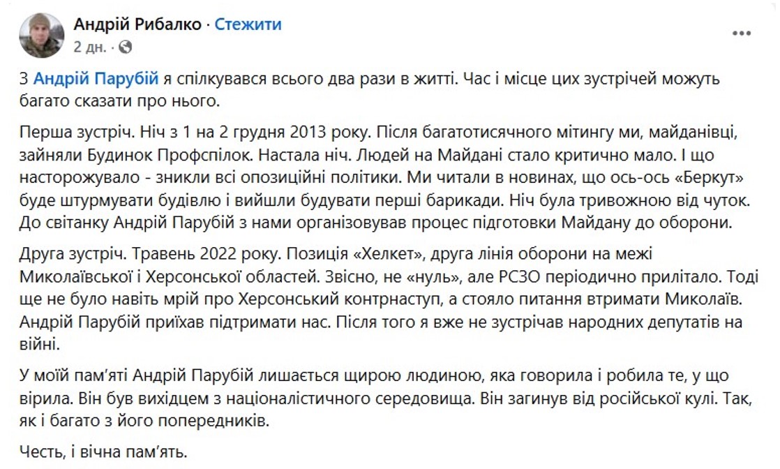 Військовий Андрій Рибалко згадує: «З Андрієм Парубієм я спілкувався всього два рази в житті. Час і місце цих зустрічей можуть багато сказати про нього. Перша зустріч. Ніч з 1 на 2 грудня 2013 року. Після багатотисячного мітингу ми, майданівці, зайняли Будинок профспілок. Настала ніч. Людей на Майдані стало критично мало. І що насторожувало - зникли всі опозиційні політики. Ми читали в новинах, що ось-ось «Беркут» буде штурмувати будівлю і вийшли будувати перші барикади. Ніч була тривожною від чуток. До світанку Андрій Парубій з нами організовував процес підготовки Майдану до оборони. Друга зустріч. Травень 2022 року. Позиція «Хелкет», друга лінія оборони на межі Миколаївської і Херсонської областей. Звісно, не «нуль», але РСЗО періодично прилітало. Тоді ще не було навіть мрій про Херсонський контрнаступ, а стояло питання втримати Миколаїв. Андрій Парубій приїхав підтримати нас. Після того я вже не зустрічав народних депутатів на війні».