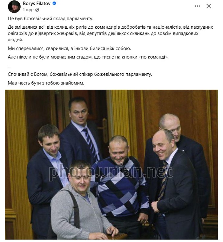 «Ми сперечалися, сварилися, а інколи билися між собою. Але ніколи не були мовчазним стадом, що тисне на кнопки «по команді». Спочивай с Богом, божевільний спікер божевільного парламенту. Мав честь бути з тобою знайомим», – написав Філатов.