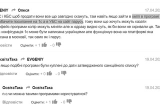 Крім того, бухгалтери з форумів зазначають про схожість програм «УБС» (Українська бухгалтерська система) та «Парус». Перша позиціонується як українська розробка, друга є російською підсанкційною бухгалтерською програмою – як і «1C». До речі, контактний телефон компанії, яка нібито займається розробкою «УБС», збігається з одним з номерів, вказаних як контакт ТОВ «Парус-Україна» і ТОВ «Парус-місто».