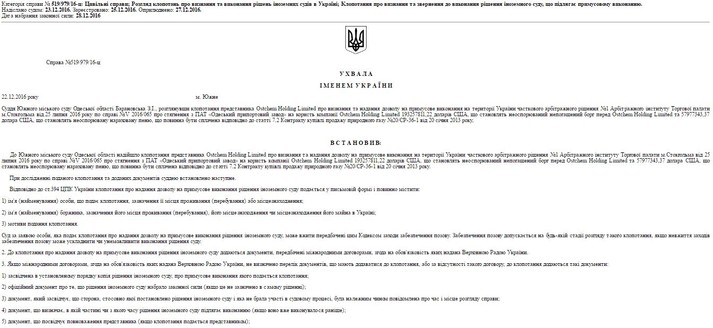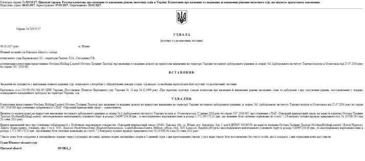Южний міський суд Одеської області визнав рішення Стокгольмського арбітражу, який задовольнив позов компанії Ostchem Дмитра Фірташа про стягнення з Одеського припортового заводу понад $250 млн через невиплату боргу за постачання газу. Таку ухвалу 6 березня цього року винесла суддя Земфіра Барановська.