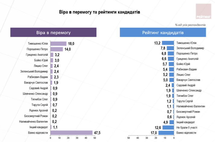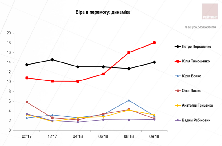 - За останній місяць зросла кількість тих, хто вірить у перемогу Тимошенко та Порошенка на майбутніх президентських виборах. 18% опитаних переконані, що наступним президентом стане Тимошенко. 14% – що Порошенко. Тих, хто вірить, що президентом стануть інші політики менше 4%. Майже половина опитаних не змогли відповісти на це питання.