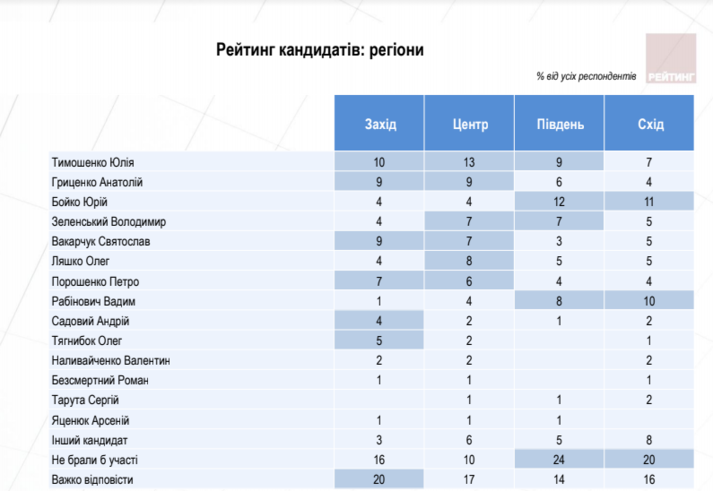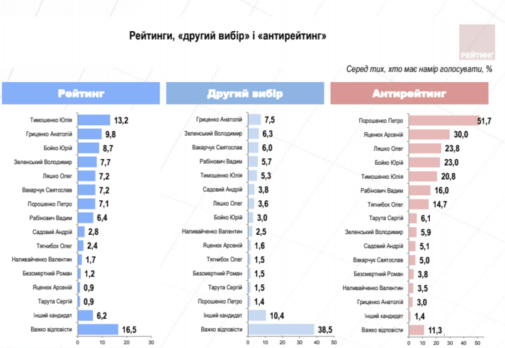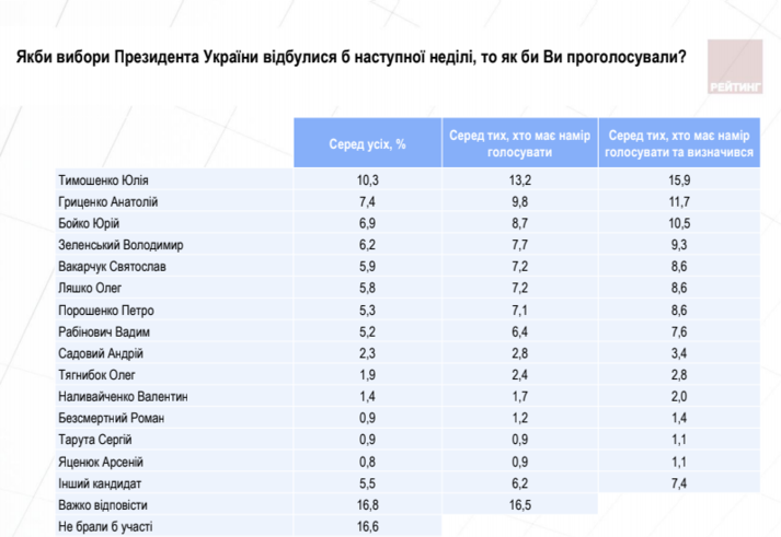 Згідно з результатами дослідження, проведеного Соціологічною групою «Рейтинг», лідером президентського рейтингу станом на кінець червня залишається Юлія Тимошенко, за яку готові проголосувати 16% тих, хто візьме участь у голосуванні та вже визначився із вибором. За Анатолія Гриценка готові віддати свої голоси 11,7%, Юрія Бойка – 10,5%, Володимира Зеленського – 9,3%, Святослава Вакарчука, Олега Ляшка, Петра Порошенка – по 8,6%, Вадима Рабіновича – 7,6%, Андрія Садового – 3,4%, Олега Тягнибока – 2,8%, Валентина Наливайченка – 2,0%, Романа Безсмертного – 1,4%, Сергія Таруту – 1,1%, Арсенія Яценюка – 1,1%.