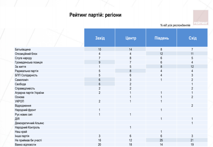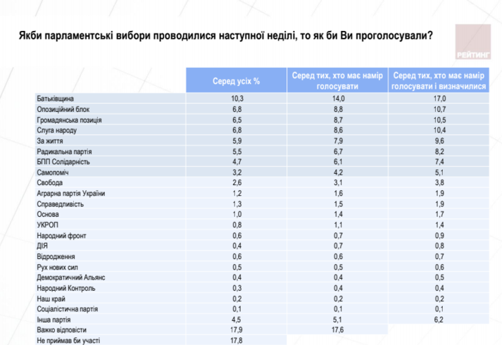 Партійний рейтинг очолює «Батьківщина», яку готові підтримати 17% тих, хто має намір прийти на вибори і визначився. Другу позицію поділяють Опозиційний блок, Громадянська позиція та партія «Слуга народу», за які готові проголосувати близько 10,5%. За партію «За життя» мають намір віддати голоси – 9,6%, Радикальну партію – 8,2%, БПП Солідарність – 7,4%, Самопоміч – 5,1%, ВО Свобода – 3,8%. Рейтинг інших партій – менше 2%.