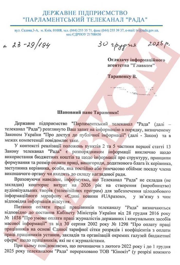 Водночас у вищезгаданій відповіді на запит «Главкома» керівник парламентського мовника «Рада» В’ячеслав Петренко все ж зауважив, що канал не складав (не закладав) кошторис витрат на 2026 рік на створення програм для забезпечення цілодобового інформаційного марафону «Єдині новини #UАразом».