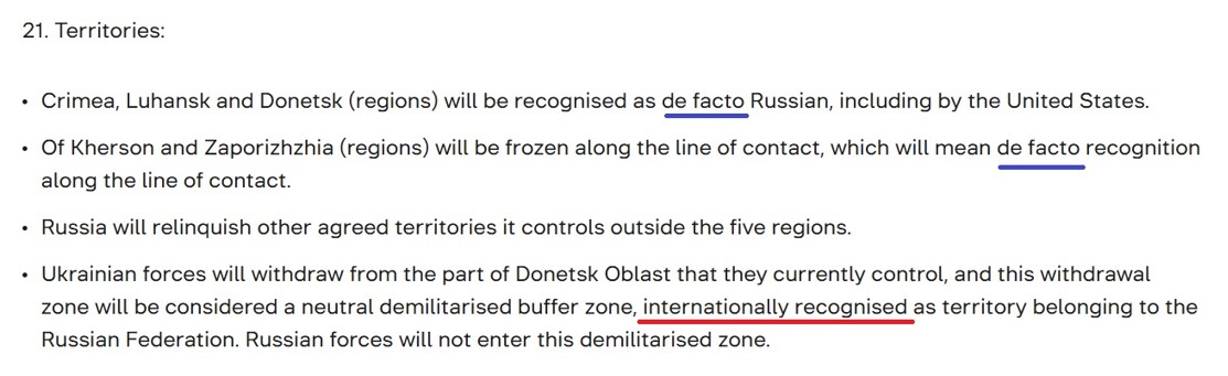 21-й пункт «мирного плану» був присвячений територіальному питанню. І містив дві вимоги, котрі між собою не стикуються. Спочатку йшлося про те, що «Крим, Луганська та Донецька області будуть визнані де-факто російськими, зокрема, Сполученими Штатами». А також про те, що «Херсон та Запоріжжя будуть заморожені по лінії зіткнення, що означає де-факто визнання по лінії зіткнення». Звернемо увагу на двічі повторене «де-факто» і рухаємося далі. Нижче читаємо таке: «Українські сили виводяться з тієї частини Донецької області, яку вони зараз контролюють, вона вважатиметься нейтральною демілітаризованою буферною зоною, міжнародно визнаною як територія, що належить РФ».