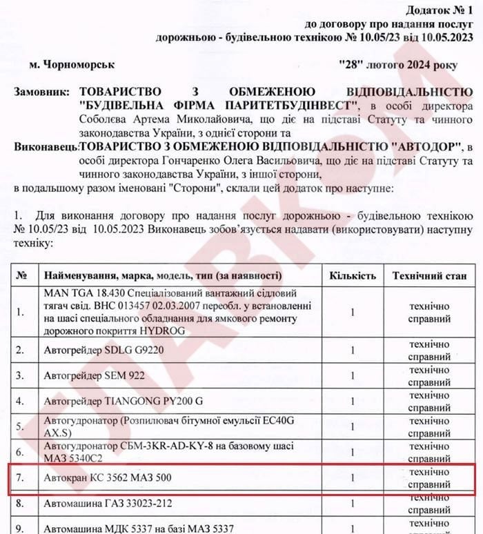Така ж курйозна історія сталася з автокраном вантажопідйомністю до 10 т. Його, як виявилося, в одеської ТОВ «Автодор» орендують і «Паритетбудінвест», і ШБУ 50.
