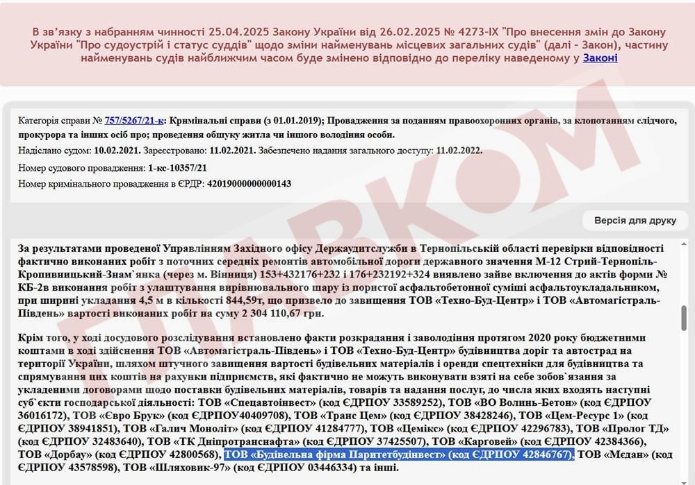 Як свідчать відомості судового реєстру, новий переможець ТОВ «Будівельна фірма «Паритетбудінвест» згадується у кримінальних провадженнях, пов’язаних із розтратою великих бюджетних сум на ремонтах доріг. В одній із таких слідство зарахувало «Паритетбудінвест» до когорти підприємств, «які фактично не можуть виконувати взяті на себе зобов'язання за укладеними договорами щодо поставки будівельних матеріалів, товарів та надання послуг».