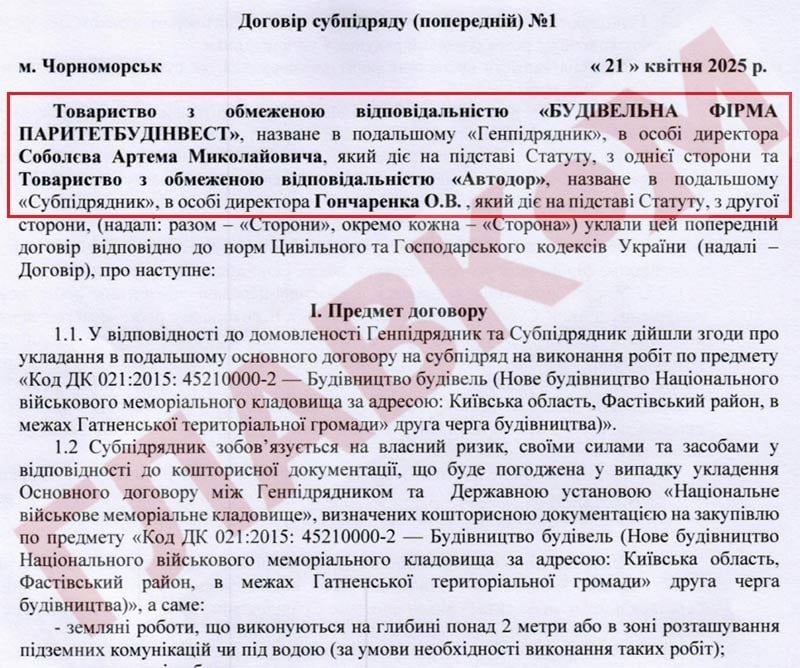 Те, що новий переможець тендера з будівництва II черги військового цвинтаря зовсім нечужий для фірми-орендодавця техніки, видає їхня спільна адреса реєстрації. Офіси «Паритетбудінвесту» і «Автодору» розміщені у місті Чорноморськ Одеської області на вулиці Праці, 20. Плюс «Паритетбудінвест» офіційно заявив, що самостійно не потягне будівництво військового цвинтаря, і запросив «Автодор» субпідрядником.
