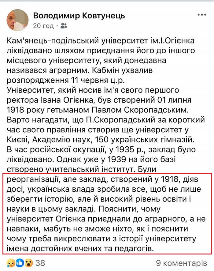 «Мені здається, що Міністерство освіти спеціально обрало Кам’янець-Подільський як периферійне місто, щоб по-тихому провести реформу, під яку міжнародні партнери виділили фінансування. Ба більше: в університеті Огієнка немає яскравої фігури, яка готова йти до суду і відстоювати збереження цього закладу», – пояснює джерело.