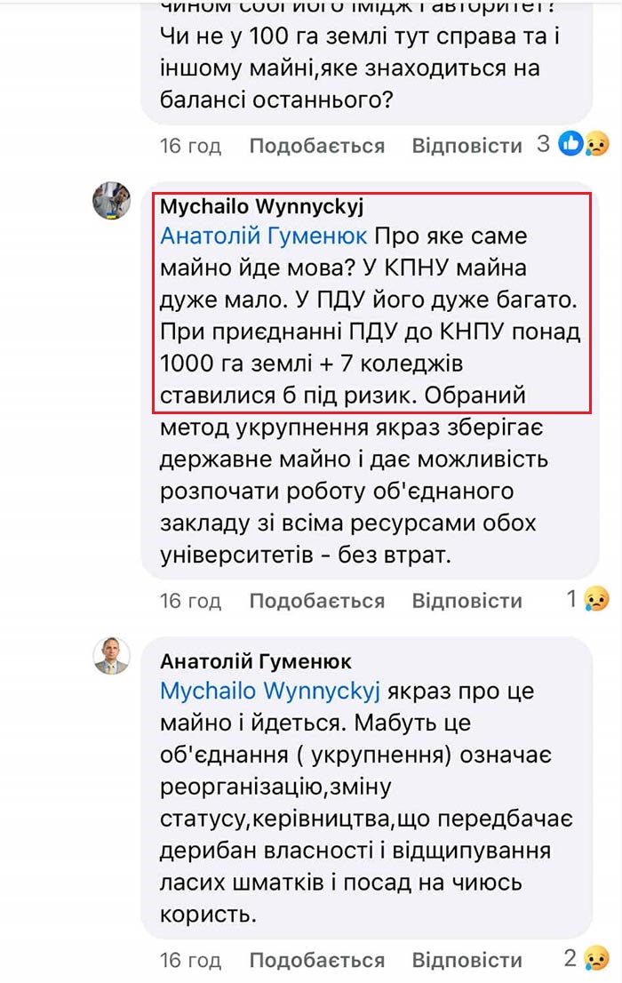 Цілком неочікувано під дописом Ковтунця у Facebook з’явився розлогий коментар того ж таки заступника міністра Михайла Винницького. Високопосадовець пояснив: Подільський державний університет має більше студентів (3500 проти 3000 в університеті Огієнка) і майна. А найголовніше – за університетом закріплено 1000 гектарів землі! Тому й до нього влада приєднує виш імені Огієнка.