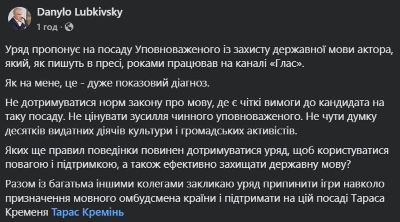 «Закликаємо внести до Кабінету міністрів кандидатуру Тараса Кременя на посаду уповноваженого із захисту державної мови замість раніше поданих кандидатів, які не хочуть або не можуть обіймати цю посаду. Вважаємо, що кандидатура чинного уповноваженого відповідає викликам, які стоять перед мовозахисною інституцією», – так завершується відозва.
