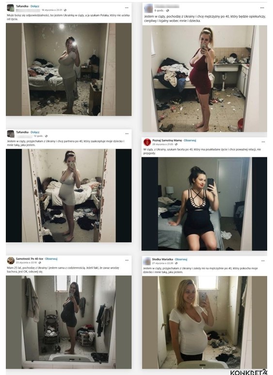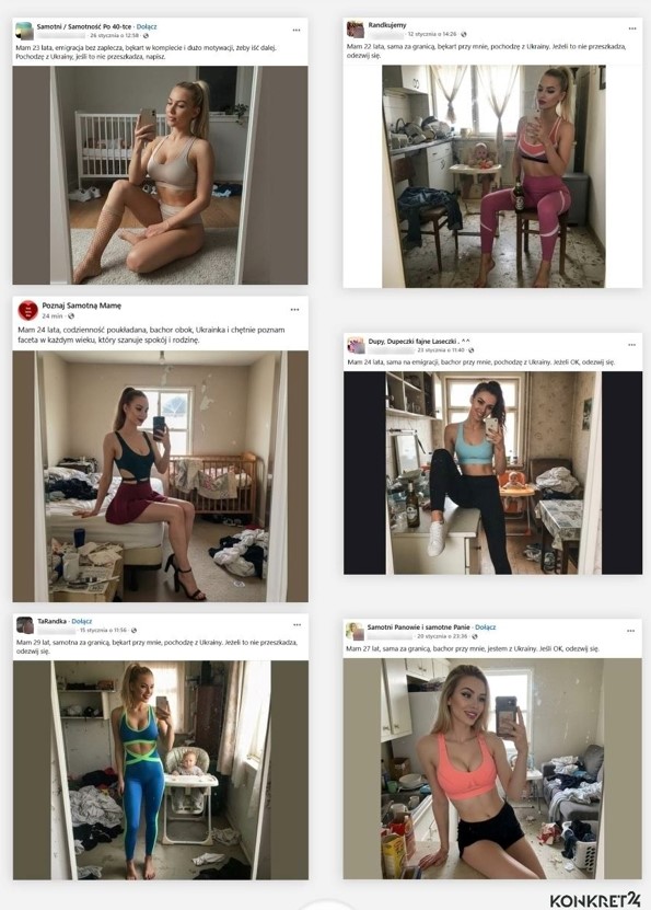 Доглянуті модельної зовнішності «українки» масово вийшли на полювання на польських чоловіків у фейсбук. Хвиля майже однакових постів з’явилася цьогоріч у лютому. Зовнішність жінок на картинках різко контрастує з безладом в їхніх кімнатах. На кожному фото десь у закутку видно дитину.