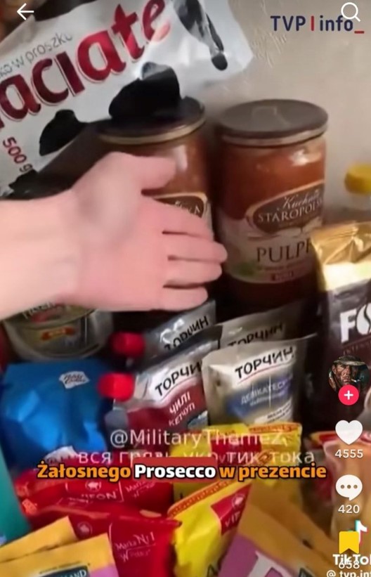 Російське походження іншого маніпулятивного відео викрили польські журналісти. У ньому українка нібито нарікає на отриману польську гуманітарну допомогу. Жіночий голос за кадром говорить: «Якесь дешеве польське г*но, вони хочуть нас отруїти! Консерви тільки собакам можна давати. Навіть креветок і просекко не поклали».