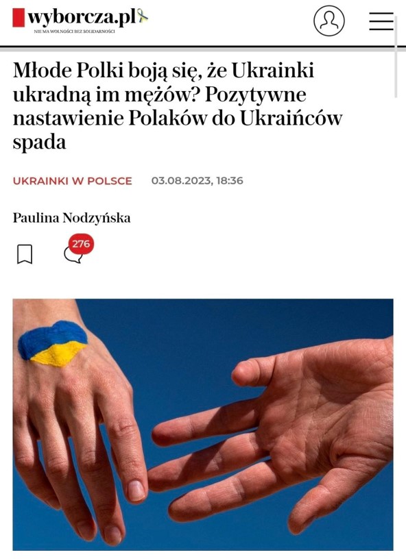 Водночас тема недостатньої вдячності та «паразитуванні» на соцдопомозі українцями стає топовою на президентських перегонах, бо на антиукраїнських наративах, як з’ясувалося, можна добре збагачуватися електоральними балами. Ліберальний кандидат мер Варшави Рафал Тшасковський несподівано першим заявляє, що треба забрати виплати 800+ у біженців. А тоді ще кандидат, а нині президент Кароль Навроцький пропонував встановити систему у лікарнях, яка б надавала першість полякам у доступі до медпослуг. Це ще більше налаштовувало поляків проти українців в цілому і українських жінок, зокрема.