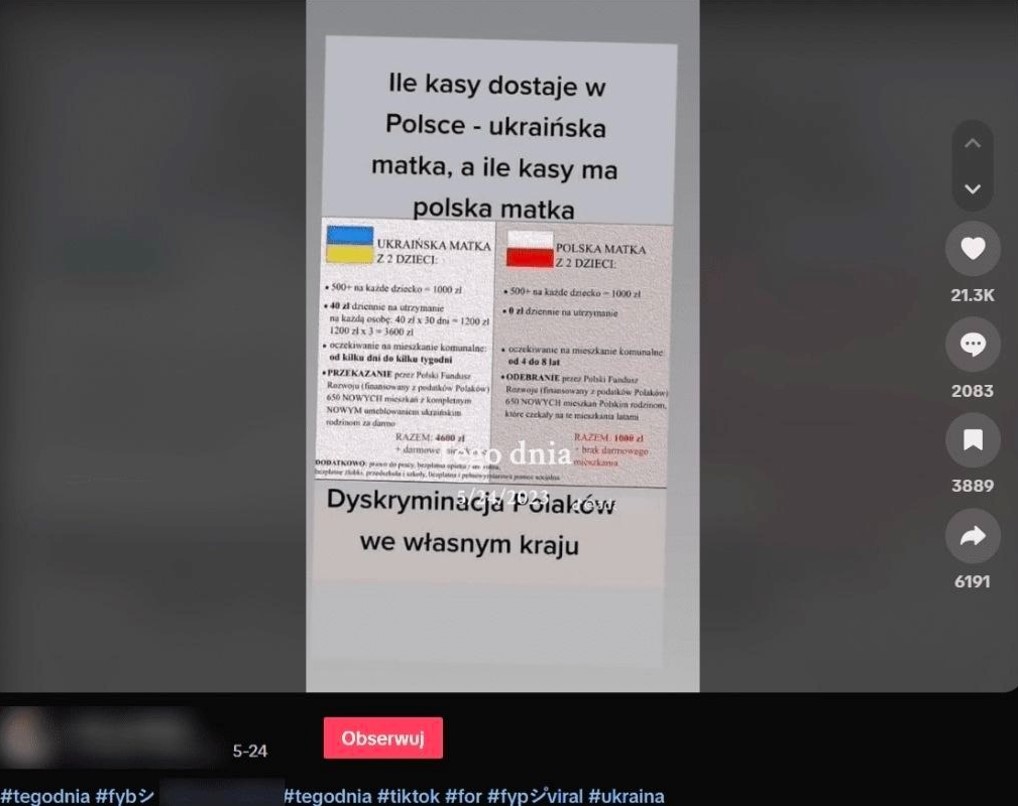 Кремлівська пропаганда швидко малює «новий образ» української жінки і усіляко розганяє фейки про те, що нібито серед біженців багато людей із високими статками, які не потребують жодної допомоги від польської держави, але полюють за соцвиплатами і відверто зловживають гостинністю польського народу. Найлегше розпалити побутовий конфлікт у «чутливих» місцях – дитячих садочках, школах, лікарнях, перетворивши жінку з «жертви війни» на «соціальну паразитку». Як наслідок це руйнує бажання допомагати Україні на рівні пересічного громадянина.