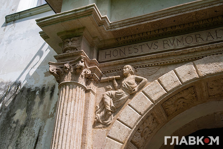 Робота вірменських майстрів гарна, але блякне на тлі краси зовнішнього порталу цієї ж брами. Тут і напівколони іонічного ордеру, і крилаті генії, і суворі маскарони, і пики левів... Поверху йде напис латиною: «Honestus rumor alterum est patrimonium» («Добра слава – також спадок», – девіз родини Понятовських).