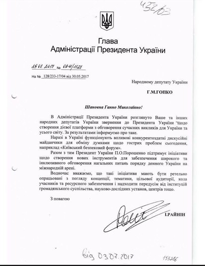 Давній критик пінчуківських конференцій нардеп Ганна Гопко також обурена антиукраїнськими закликами бізнесмена. У травні минулого року вона направила листи до Адміністрації президента, прем’єр-міністра та голови Верховної Ради із пропозицією створити альтернативний форум. Звернення підписали дев’ятеро нардепів.