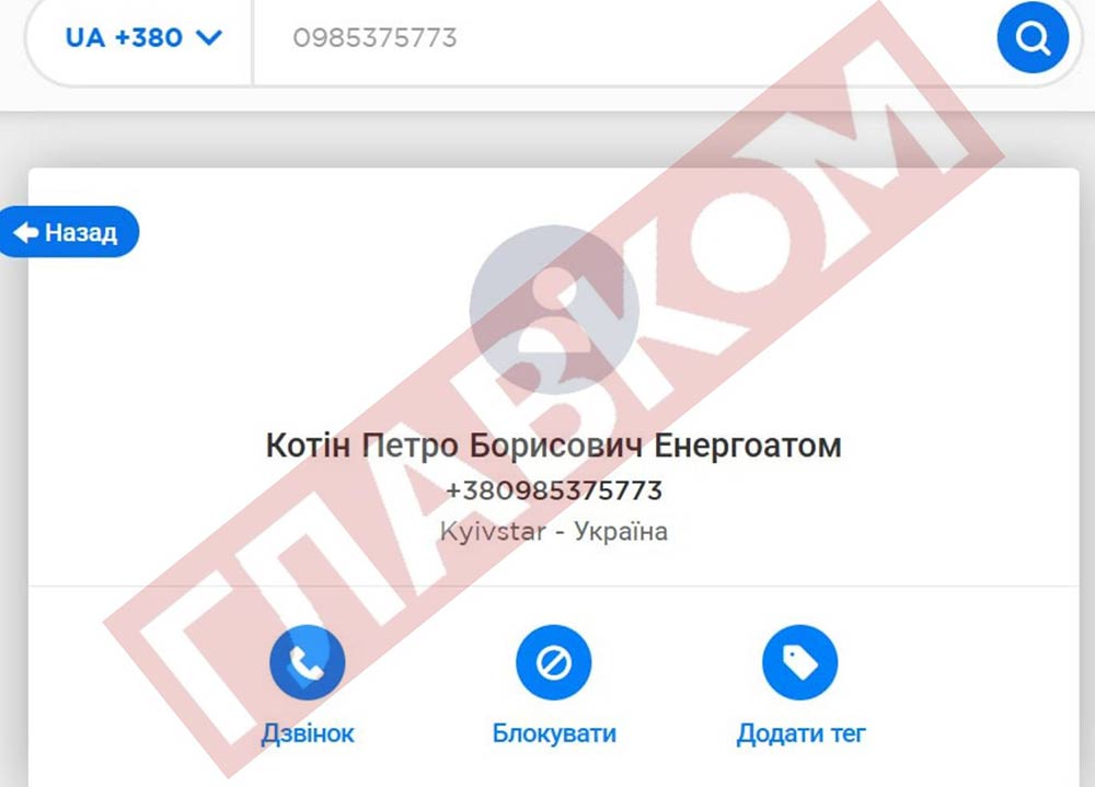 Контактний телефон новоявленого підприємця Петра Котіна у застосунку GetContact підписано як «Котін Петро Борисович Енергоатом».