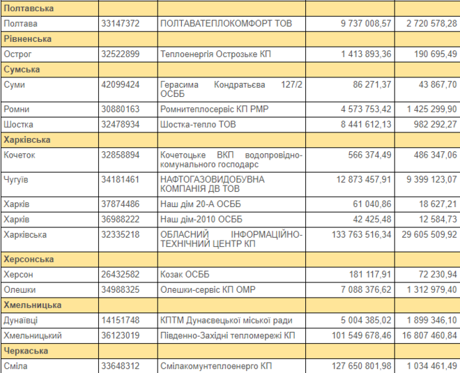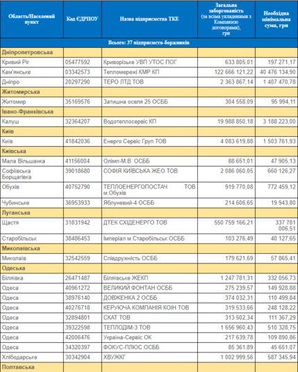 Задолженность за газ имеют 37 производителей тепла в 30 городах Украины, в частности в Днепре, Киеве, Кривом Роге, Николаеве, Одессе, Полтаве, Харькове, Херсоне и Смеле.