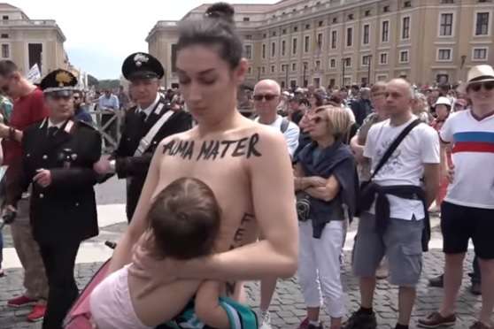 В честь Международного дня матери в воскресенья, 13 мая, активистка украинского движения Femen устроила акт публичного кормления ребенка грудью на площади Сан Пьетро в Ватикане (Италия). На теле активистке была надпись: Alma Mater (мать кормящая).
