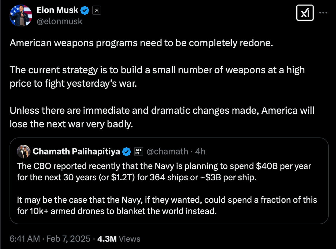 Маск прокомментировал это сообщение словами, что сейчас США тратят большие деньги на небольшое количество оружия для «ведения вчерашней войны».
