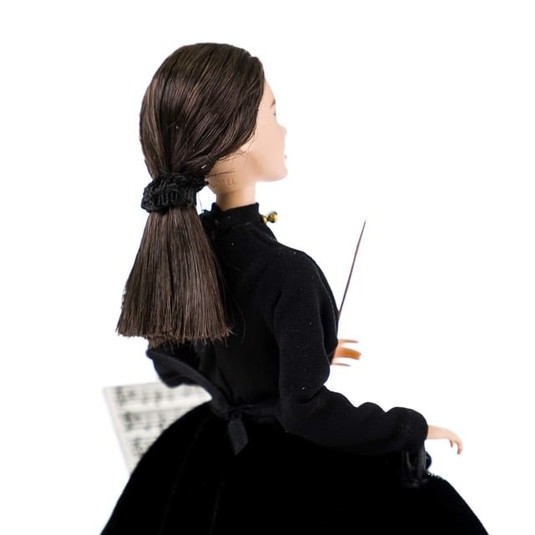 Барби-дирижер одета как ее прототип: в черный элегантный костюм и со смычком.