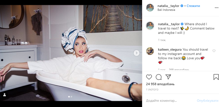 Тейлор опубликовала несколько фейковых сториз из самолета и аэропорта, а также видео с пейзажами курорта. Все эти материалы она просто взяла из интернета по хештэгу #bali.