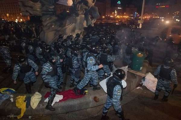 Посреди ночи 30 ноября их разогнали и жестоко избили беркутовцы. Студентов преследовали и отлавливали прямо на улицах. Протестующие искали убежища в Михайловском соборе. Пока шло побоище, на Майдан привезли новогоднюю елку и начали устанавливать.