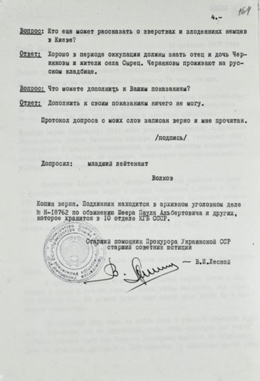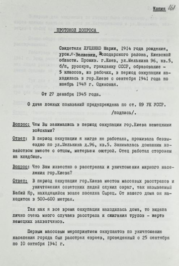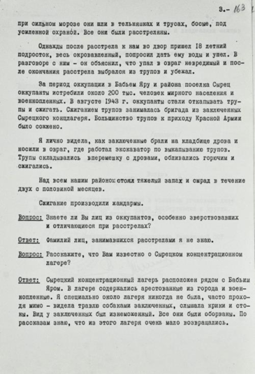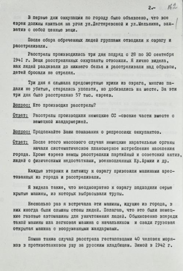 «Я видела, как людей раздевали и расстреливали над обрывом, детей бросали без расстрела... Однажды к нам во двор забежал подросток, весь в крови, просил дать ему воды. Он упал в овраг невредимым и после окончания расстрелов выбрался из-под трупов», – зафиксировано в ее показаниях.