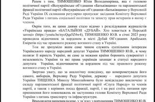 Депутат от «Слуги народа» Марьяна Безуглая подала депутатское обращение в ВО «Батькивщина» с требованием рассмотреть вопрос об исключении из членов партии и из одноименной фракции лидера «Батькивщины» Юлию Тимошенко. Фото запроса Безуглая обнародовала в Facebook.