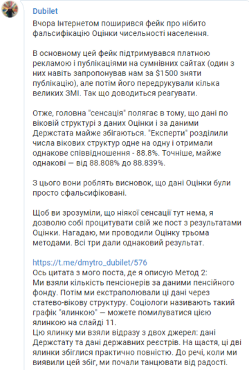 «Украинский центр общественных данных» заявил, что электронная перепись населения, проведенная министром Кабинета министров Дмитрием Дубилетом, могла быть сделана простым умножением на 0,888 цифр Государственной службы статистики. Специалисты отмечают, что оценки министра странно коррелируются с данными официальной статистики. Дубилет, в свою очередь, назвал эти данные проплаченным фейком.