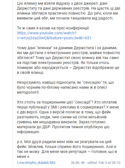 «Вчера в интернете распространился фейк о якобы фальсификации Оценки численности населения. В основном этот фейк поддерживался платной рекламой и публикациями на сомнительных сайтах (один из них предложил нам за $1500 снять публикацию), но затем его перепечатали несколько крупных СМИ. Так что приходится реагировать», – отметил Дубилет.