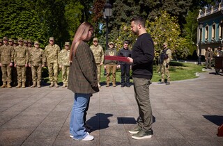 Также глава государства передал «Золотую звезду» дочери командира мотопехотной роты капитана Валерия Глебова, удостоенного звания Героя Украины посмертно.