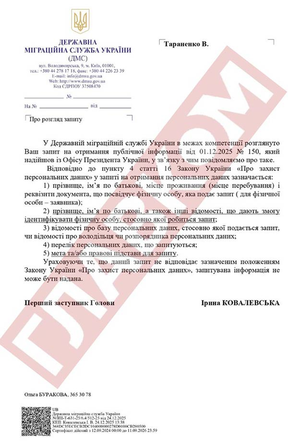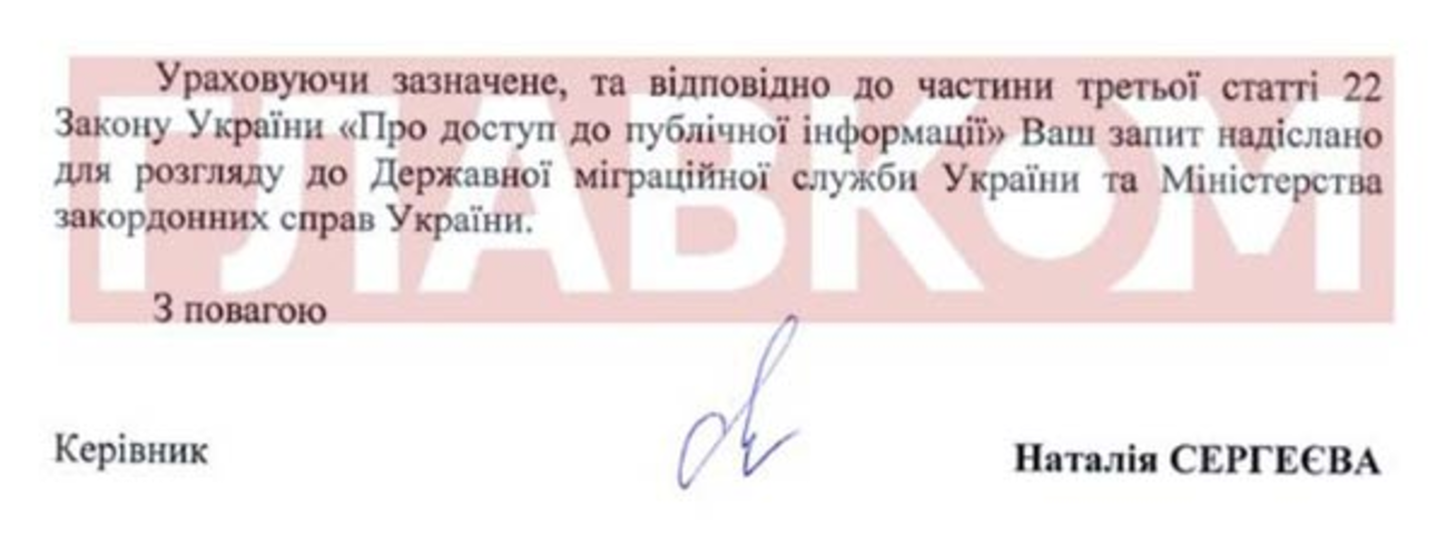 Вместо этого первая заместительница главы Государственной миграционной службы Ирина Ковалевская отказала в ответе на запрос «Главкома», сославшись на неполное его оформление.