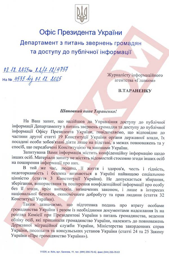 «Запрашиваемая вами информация содержит конфиденциальную информацию о других лицах. Материалы запроса не содержат сведений о согласии других лиц на распространение информации о них... Не допускается сбор, хранение, использование и распространение конфиденциальной информации о лице без его согласия, кроме случаев, определенных законом, и только в интересах национальной безопасности, экономического благосостояния и прав человека (статья 32 Конституции)», – отметила руководитель департамента по вопросам обращений граждан и доступа к публичной информации Офиса президента Наталья Сергеева.