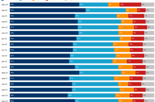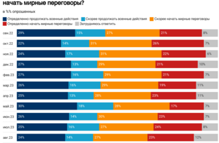 В сентябре поддержка войны значительно не изменилась: 73% одобряют вторжение в Украину (в августе – 70%). Не поддерживают 20% (в августе – 21%). Как и в предыдущие месяцы (за исключением мая 2023) сторонников перехода к мирным переговорам несколько больше, чем противников, в сентябре первых – 51% респондентов (в августе – 50%).