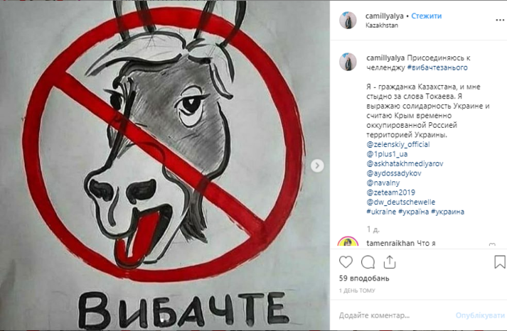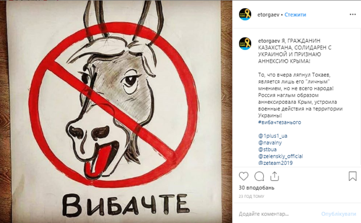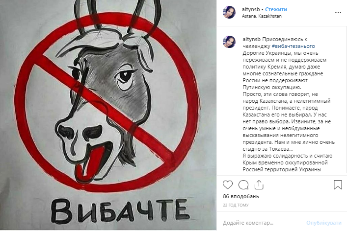 Жители Казахстана запустили в соцсетях флешмоб #ВибачтеЗаНього. Казахстанцы извиняются перед украинцами за слова своего президента Касым-Жомарт Токаева об аннексии Крыма.