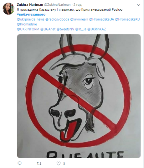 Казахи в соцсетях массово пишут, что Россия наглым образом аннексировала Крым и устроила военные действия на территории Украины. Они также отмечают, что считают Крым временно оккупированной Россией территорией Украины.