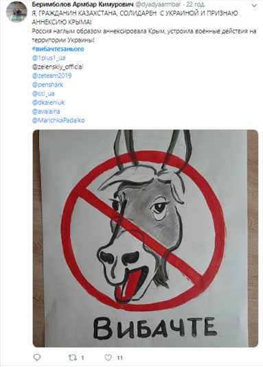 Участники флешмоба в своих извинениях используют плакат с надписью на украинском языке: «Вибачте за нього» и изображением головы осла. С данным плакатом 5 декабря казахстанский художник Асхат Ахмедьяров вышел к зданию посольства Украины в Нур-Султане просить прощения у народа Украины за отрицание Токаевым факта аннексии Крыма. Ахмедьярову не позволили развернуть плакат у стен посольства.