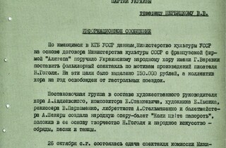 Справка базируется на оперативных данных по 31-летней Матвиенко, которая в то время пела в Украинском народном хоре им. Г. Веревки, участвовала в постановке спектакля «Когда цветет папоротник» по произведениям Гоголя и проверялась через свои «идейно вредные высказывания».