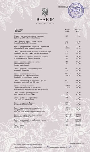 Одно из самых дорогих блюд ресторана «Велюр» – это утка по-пекински. Ее стоимость составляет 3787 гривен за 1,3 килограмма. Примерно во столько же обойдутся салат с омаром или тартар с омаром.