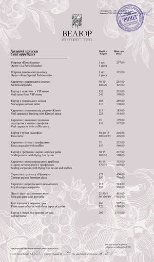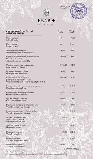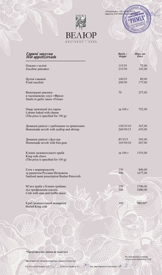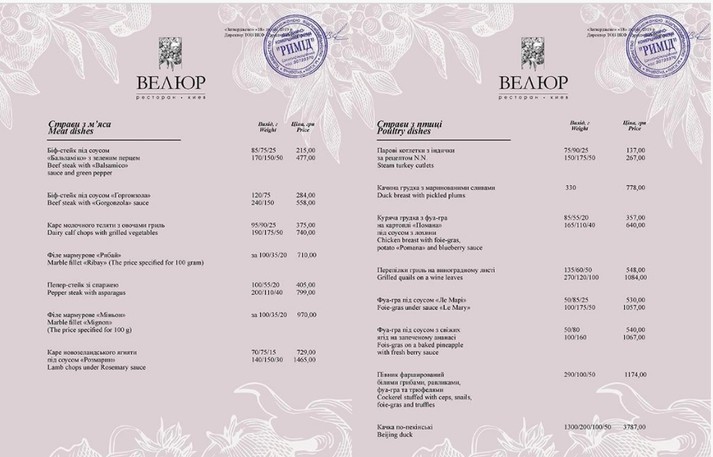 В киевском ресторане «Велюр», который принадлежит нардепу от «Слуги народа» Николаю Тищенко, диапазон цен гораздо выше, чем в среднем киевском кафе. Так, за двойной эспрессо здесь нужно выложить 320 грн. За маленькую бутылочку воды «Боржоми» 85 грн. Это видно из чека, датированного 10 августа, который опубликовал в Фейсбуке бизнесмен и общественный деятель Евгений Городецкий.