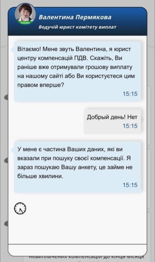 После этой процедуры пользователя перенаправляет в чат с юристом, который говорит об обязательном заполнении анкеты, где нужно указать полный номер своей банковской карты.