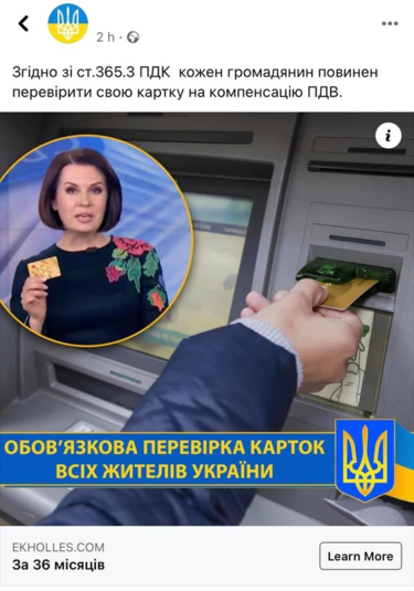 По его словам, в Facebook он наткнулся на рекламу об «украинском законе», благодаря которому граждане могут вернуть себе НДС. Авторы сопроводили рекламную публикацию фотографиями известных людей, в том числе ведущей телеканала «1+1» Аллы Мазур и комментариям восторженных пользователей, которым «удалось получить компенсации» в размере от 30 до 80 тысяч гривен.