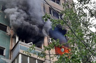 Вторая ракета разрушила секцию с четвертого по девятый этажи жилого дома. Возник пожар.